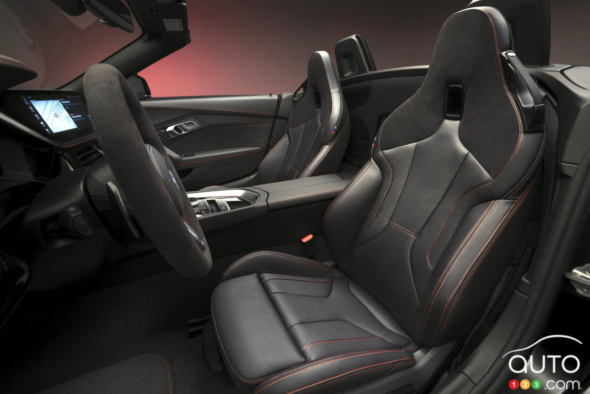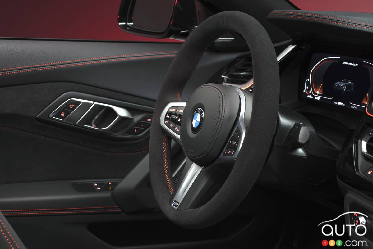 L’intérieur se distingue par des surpiqûres rouges contrastantes. Elles traversent la planche de bord, les panneaux de porte, la console et les sièges M Sport en cuir Vernasca et Alcantara. On retrouve aussi des tapis bordés de rouge, des ceintures aux couleurs M et des seuils de porte « Z4 FINAL EDITION ».