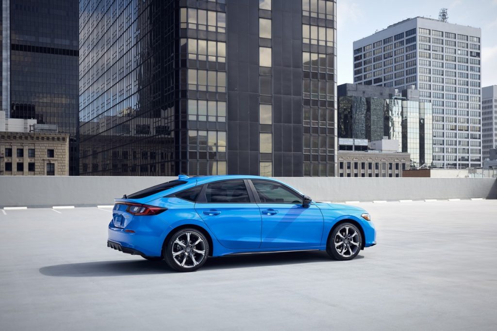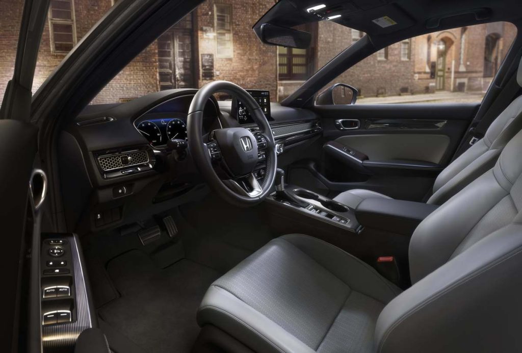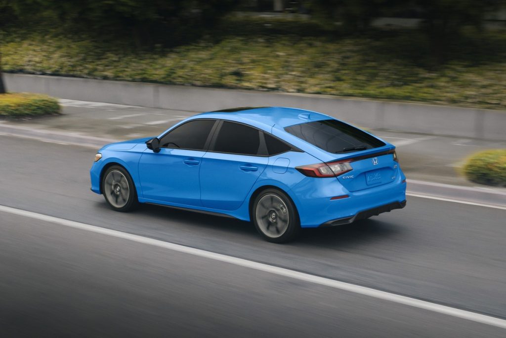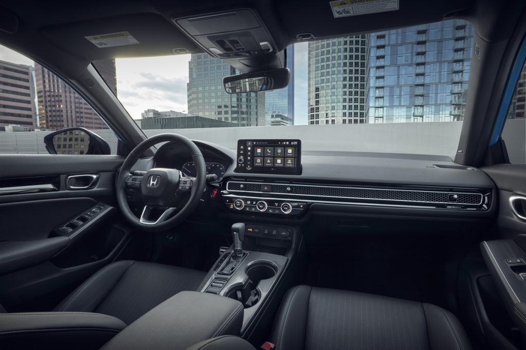 À l’intérieur, Honda joue la carte de la sobriété sportive : sièges bien moulés, commandes simples, et un écran qui est devenu plus conviviale. Le volume, les menus, l’ergonomie — tout est logique, tout fonctionne. Le système de son ajoute un petit truc… disons spécial : il amplifie le bruit du moteur pour vous faire croire que vous êtes dans une Civic Si, alors que vous roulez avec un moteur hybride qui médite sur les économies de carburant. Bien fait, discret et le petit subterfuge opère avec un certain charme. Cela dit, la qualité du système audio gagnerait à être de meilleure qualité. Honda Sensing travaille fort ici. L’assistance au maintien de voie est moins stressée qu’un surveillant d’examen, le régulateur adaptatif freine comme un vrai humain et l’affichage du tableau de bord vous montre même une mini-Civic qui allume ses feux de freinage lorsque la voiture le fait. Ça frôle le dessin animé, mais c’est efficace. Efficace sans être intrusif, enfin , pas trop. Un seul bémol qui vient de la vue ¾ arrière qui est passablement obstruée pat le hayon et les petites vitres latérales. L’angle mort est important et il faut tourner la tête régulièrement pour vérifier la présence de véhicules dans les voies de gauche ou droite.