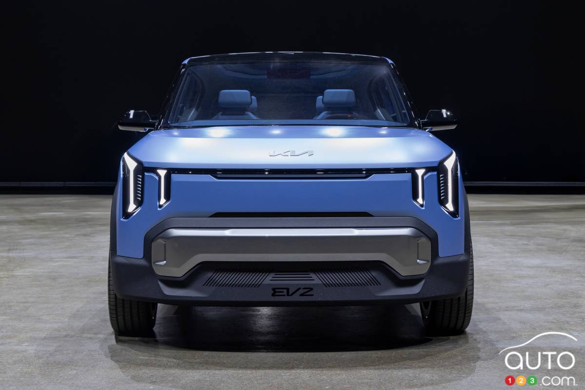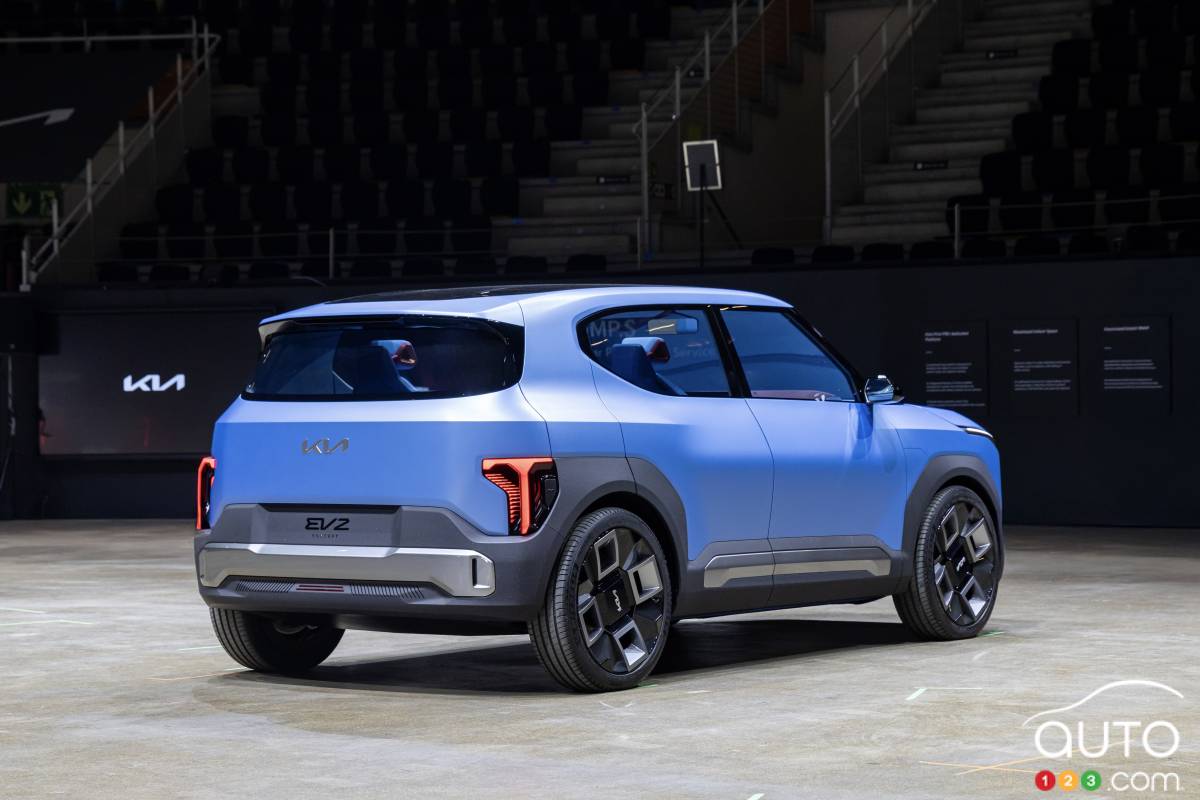 Kia accélère son offensive électrique avec l’arrivée du EV2, un VUS sous-compact qui passera du statut de concept à celui de modèle de production lors de sa première mondiale au Salon de l’auto de Bruxelles, le 9 janvier 2026.