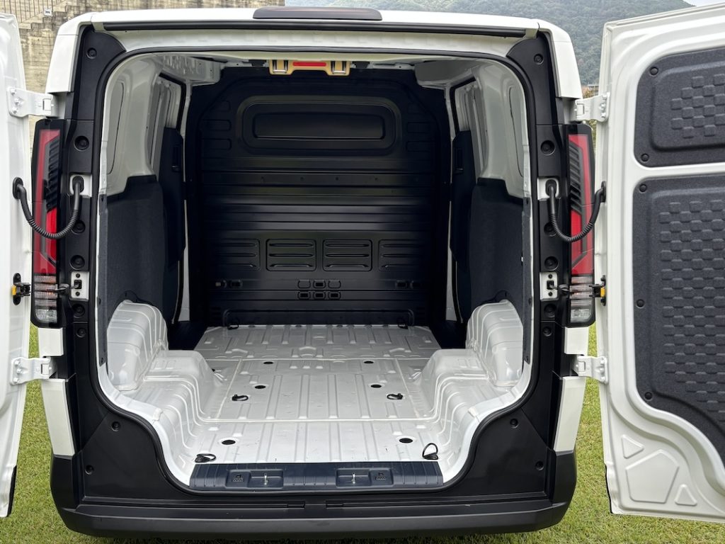 Kia nomme cette approche« Les opposés réunis », le PV5 Cargo ressemble à un mélange entre un conteneur maritime et un bidule Apple. Ses lignes nettes, ses phares fusionnés au pilier A et ses pare-chocs modulaires respirent la modernité. Avec un Cx de 0,29, Kia ose même parler d’aérodynamisme — un exploit pour un objet qui pourrait servir de presse-papier. À terme, trois hauteurs de toit sont offertes (standard, long et haut), mais pour le moment, seule le toit régulier sera en vente à compter du 4e trimestre de 2026. En prime, la marche de 419 mm évite le mal de dos aux livreurs de paniers bio. Au chapitre du format, le PV% est environ 50 mm plus petit que le défunt NV200 de Nissan, mais utilise plus efficacement son espace intérieur et en fait un véhicule idéal pour les livraisons urbaine.