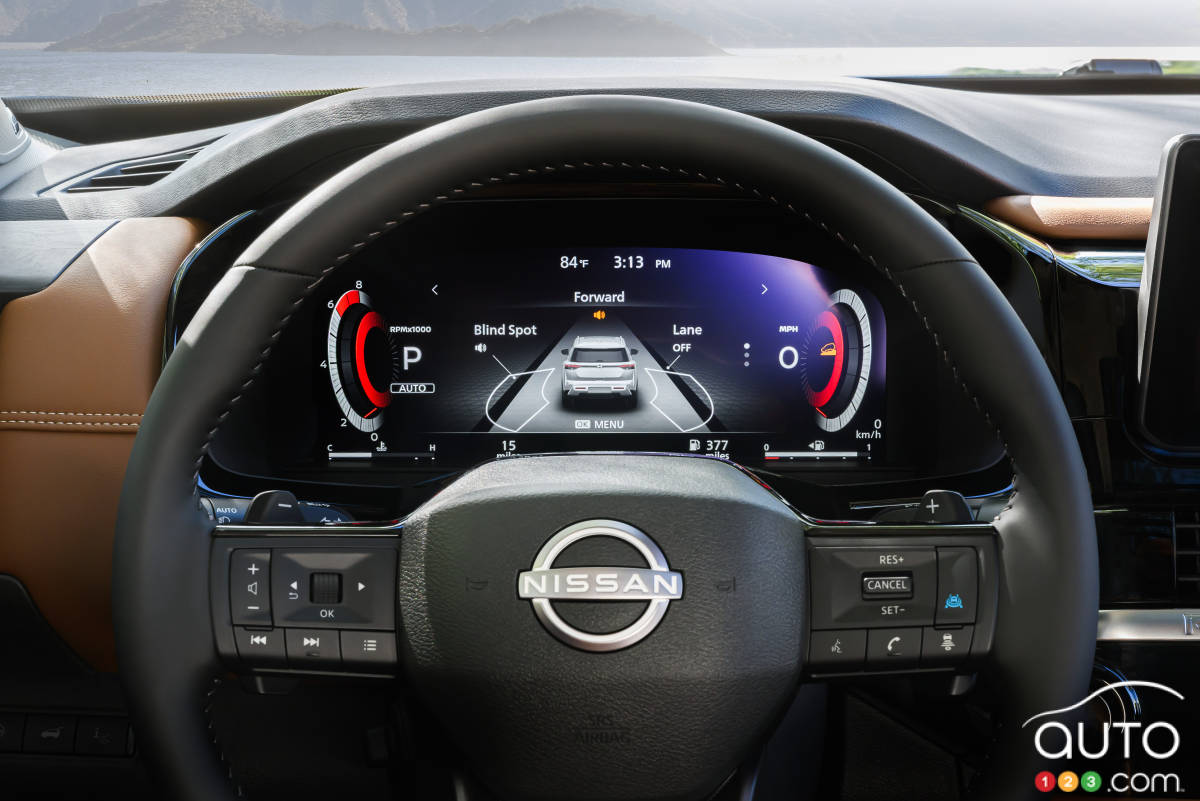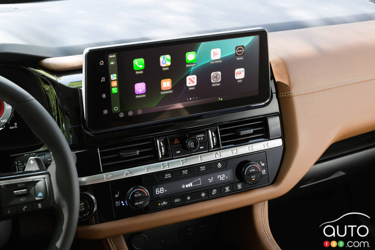 C’est surtout à bord que le Pathfinder 2026 fait ses changements les plus notables. L’écran d’infodivertissement central passe de 8 à 12,3 pouces et intègre désormais sans fil Apple CarPlay et Android Auto. Le tableau de bord conserve sa disposition familière, mais profite d’une présentation plus moderne.