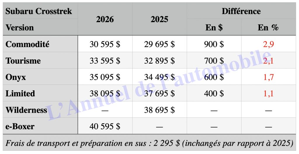 Les prix de base (prix de détail suggéré par le fabricant ou PDSF) des différentes versions de la Crosstrek 2026 s’étalent désormais de 30 595 $ à 40 595 $. Par rapport aux versions qui figuraient au catalogue 2025, on observe des augmentations variant de 1,1 à 2,9 %, comme l’illustre le tableau ci-dessous.